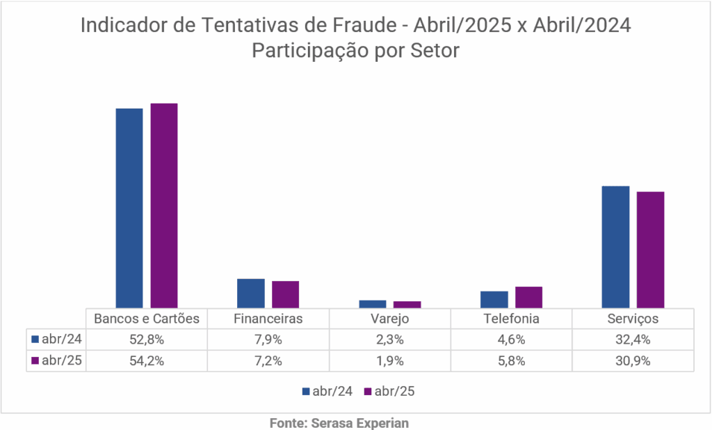 Bank- og kortsektoren fortsatte å lede rangeringen av svindelforsøk i Brasil, og konsentrerte 54.2% med poster i april 2025. Så vises sektorene Tjenester (30.9%), Finansiell (7.2%), Telefoni (5.8%) og Detaljhandel (1.9%).