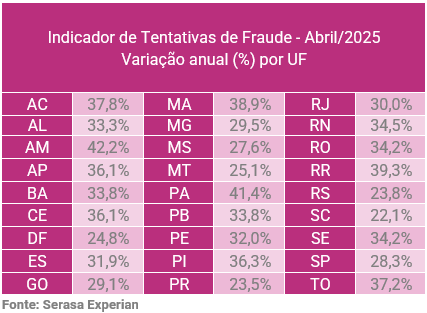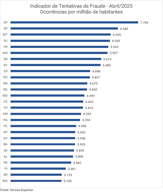 I proporsjonal med befolkningsanalysen presenterte det føderale distriktet den høyeste frekvensen av svindelforsøk i april 2025, med 7 759 forekomster per million innbyggere. Deretter delstatene Sao Paulo (6 540), Mato Grosso (6 093) og Rio de Janeiro (6 045) alle over landsgjennomsnittet på 5 166 skiller seg ut, og med en sterk digital tilstedeværelse og høy bankvirksomhet, faktorer som øker risikoeksponeringen.